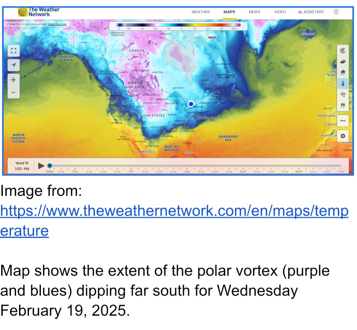 Look Up: We often have fair warning (1 - 2 weeks) of oncoming cold weather originating in weakening of northern jet streams temperature differential between mid latitudes. These are a regular part of meteorological forecasts. The Weather Network maps we used are just one source. If you have a favourite source for such information, please let us know and we will add to our resources page.