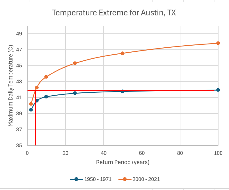In the past 1950 to 1971, a 42 °C (107.5 °F) might happen at least once in 100 years. However, as our climate has changed, based on the recent data of 2000 to 2021, that temperature can now happen at least once in four and a half years (see the red lines where it intersects the orange curve and its associated Return Period axis). This is a 25 times increase in the frequency compared to the 1950 to 1971 period. We are experiencing temperatures like this fairly frequently these days.