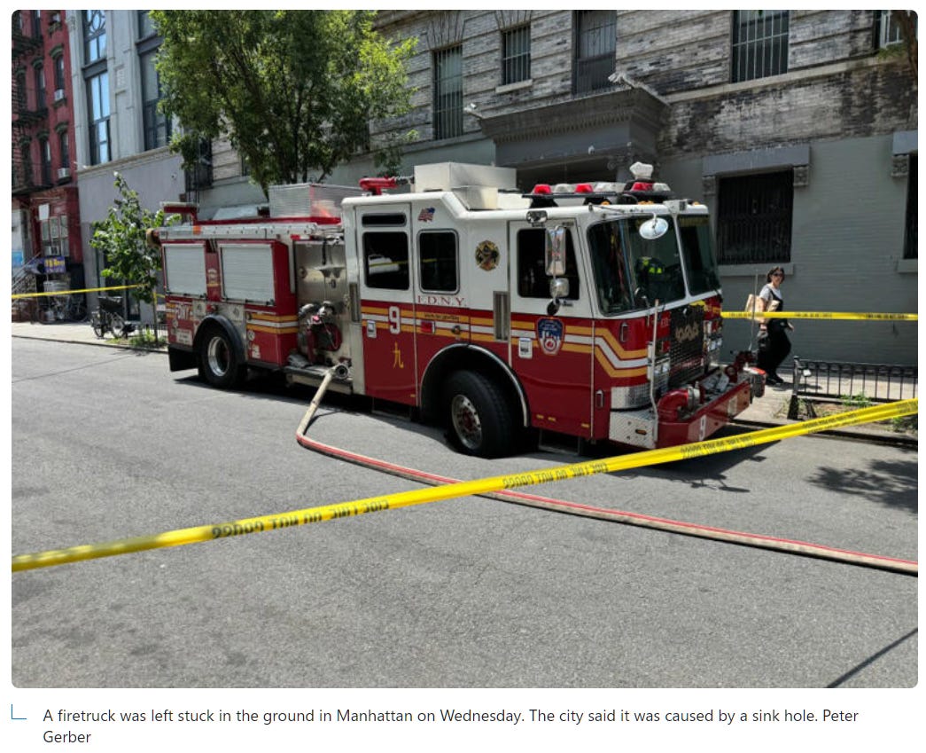 Downtown Manhattan during the June 2025 heatdome - Firetruck gets stuck in a sink hole when the pavement melts into it with temperatures reaching 96F, image from: